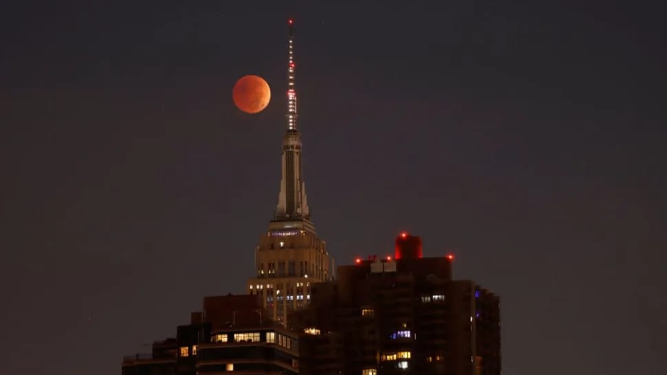 A Total lunar eclipse setting over New York City in November of 2022 (Image Credit: Gary Hershorn/Getty Images).